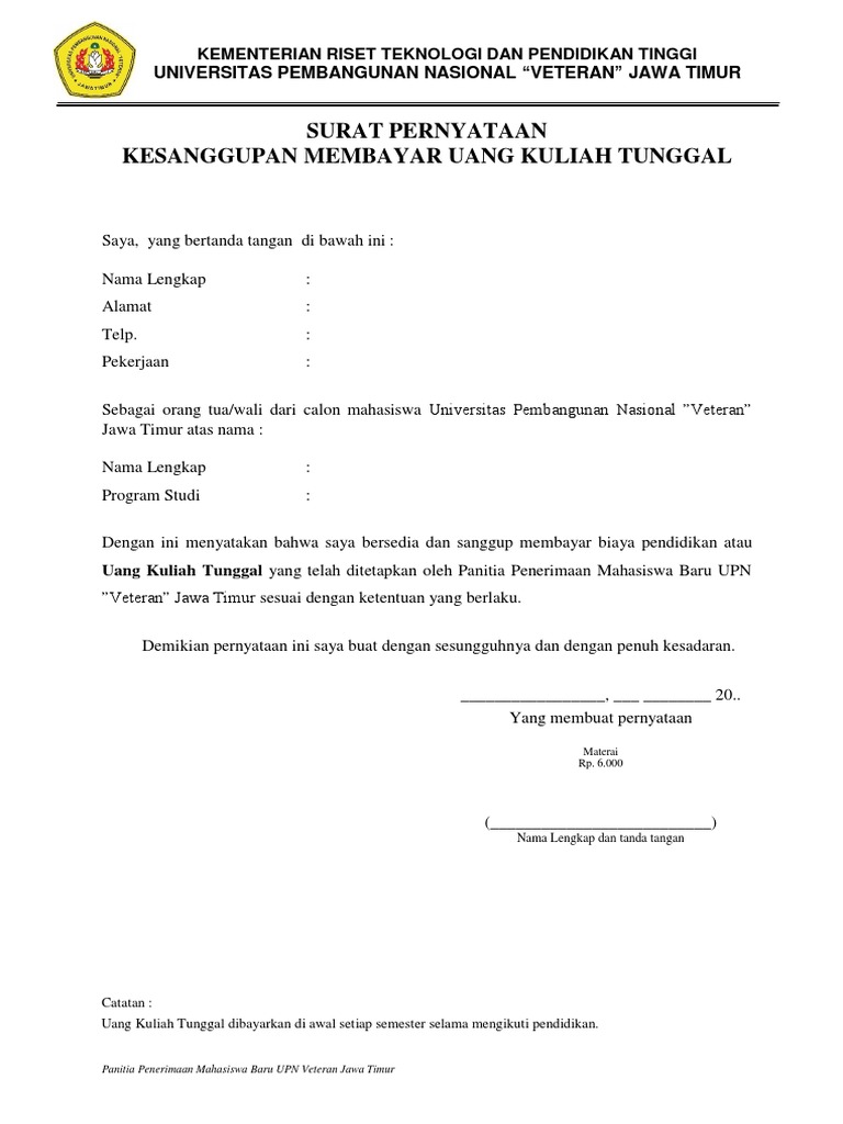 Menyatakan kesanggupan untuk membayar biaya uang kuliah tunggal (ukt) selama masa tempuh pendidikan tanpa paksaan dari pihak manapun. Nama pekerjaan alamat rumah no. Surat penyataan kesediaan dan kesanggupan membayar biaya pendidikan. Surat contoh surat pernyataan kesanggupan bayar cicilan. Surat pernyataan sendiri memiliki beberapa jenis, seperti surat pernyataan kerja, surat pernyataan kesanggupan, surat pernyataan belum menikah, dan masih banyak lagi yang lain.