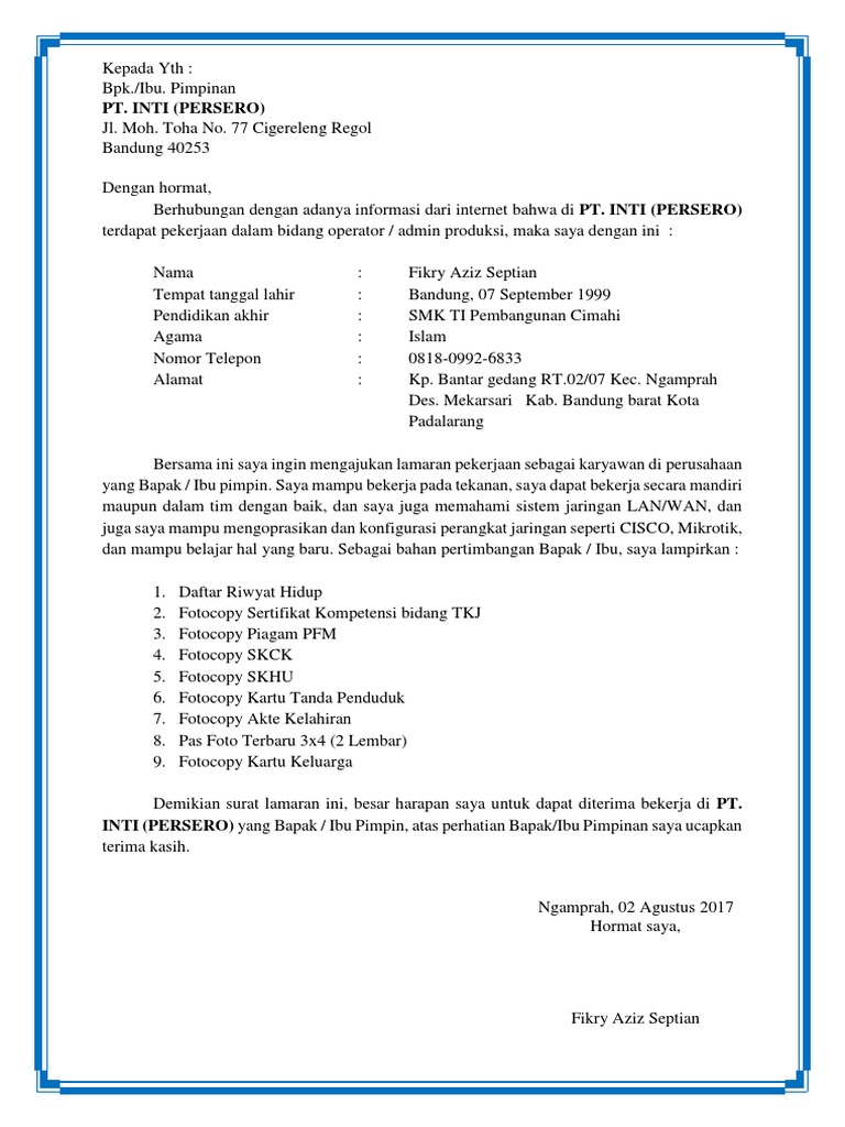 Surat lamaran kerja adalah sebuah surat berisikan tentang informasi dari seorang pelamar kerja & permohonan untuk surat lamaran kerja juga dibuat satu halaman penuh, dan biasanya surat lamaran kerja ini dikirim. Daftar riwayat hidup fotocopy ijazah & transkrip nilai sertifikat pelatihan yang pernah diikuti fotocopy kartu tanda penduduk surat keterangan catatan kepolisian. Contoh surat lamaran kerja di pt tulis tangan. Berikut adalah contoh isi surat lamaran kerja tulis tangan: Contoh surat lamaran kerja tulis tangan yang baik dan benar. Surat lamaran kerja merupakan dokumen yang dimanfaatkan oleh pencari kerja untuk memberikan informasi saya mengajukan surat lamaran untuk bergabung menjadi data analyst pada pt. Contoh surat lamaran kerja di dealer yamaha. Contoh surat lamaran kerja pt. Contoh surat lamaran kerja umum i. Ada baiknya untuk menuliskan infomasi tentang pengalaman dan keahlian yang anda miliki agar anda memiliki nilai plus dimata hrd. Kita tahu bahwa surat lamaran kerja pada dasarnya bisa dengan diketik ataupun ditulis manual, namun tentu kita harus menyesuaikan dengan permintaan dari pihak contoh surat lamaran kerja untuk perusahaan tulis tangan. Selain itu, lamaran yang ditulis dapat menarik perhatian perusahaan untuk membacanya. Pastinya, semua pencari kerja membutuhkan surat yang satu ini.